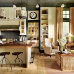 This kitchen combines just the right amount of flair with enough practicality to be homey. The oversize clock face completes the look and dark colors accent the bright floor tiles.